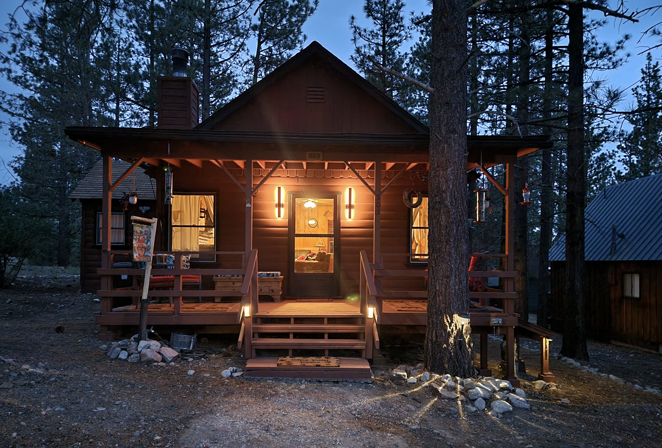 Cozy cabin centrally located in Big Bear. This cabin accommodates sleeping 7-8 people.This Cabin is clean and decorated to create a warm and relaxing experience on a quiet private street. Front patio has two tables which allows seating for 6 people to enjoy coffee, drinks while watching the squirrels, birds and chipmunks eating their food. This cabin has a fully stocked kitchen ready for any chef to cook up a storm. Kitchen island has coffee bar with two barstools. A table that sits 6 people overlooking the family room which has a gas fireplace and a huge smart tv for everyone to enjoy. Down the hall is the first bedroom which has a bunkbed, a single twin bed and a foldout bed with a tall dresser. Further down the hall is the bathroom with shower/tub combo. Laundry room located inside down the hall. Master room has a king size bed, two end tables and a bathroom with a shower. Large back patio with lights, gas firepit, gas barbeque, gas heater, a table which allows for 8 people to sit and enjoy the scenery of the beautiful smell of the pine trees and wildlife.